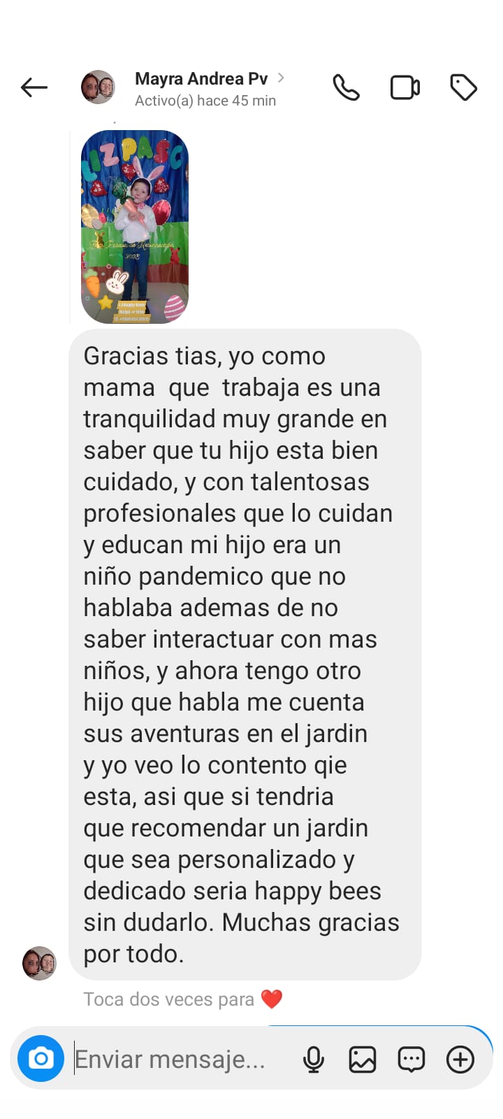 Comuníquese con nosotros para resolver sus dudas a través del correo: happybeesjardininfantil@gmail.com o el correo de contacto de esta pagina, también usando el teléfono:+569 64543215.
